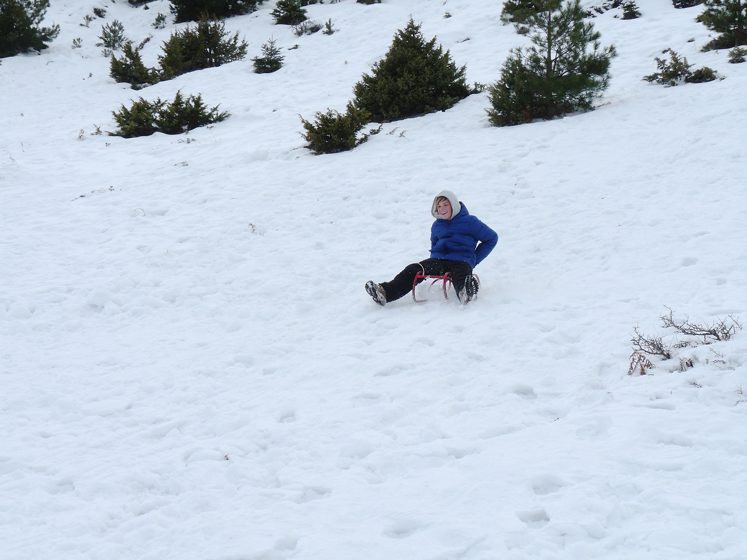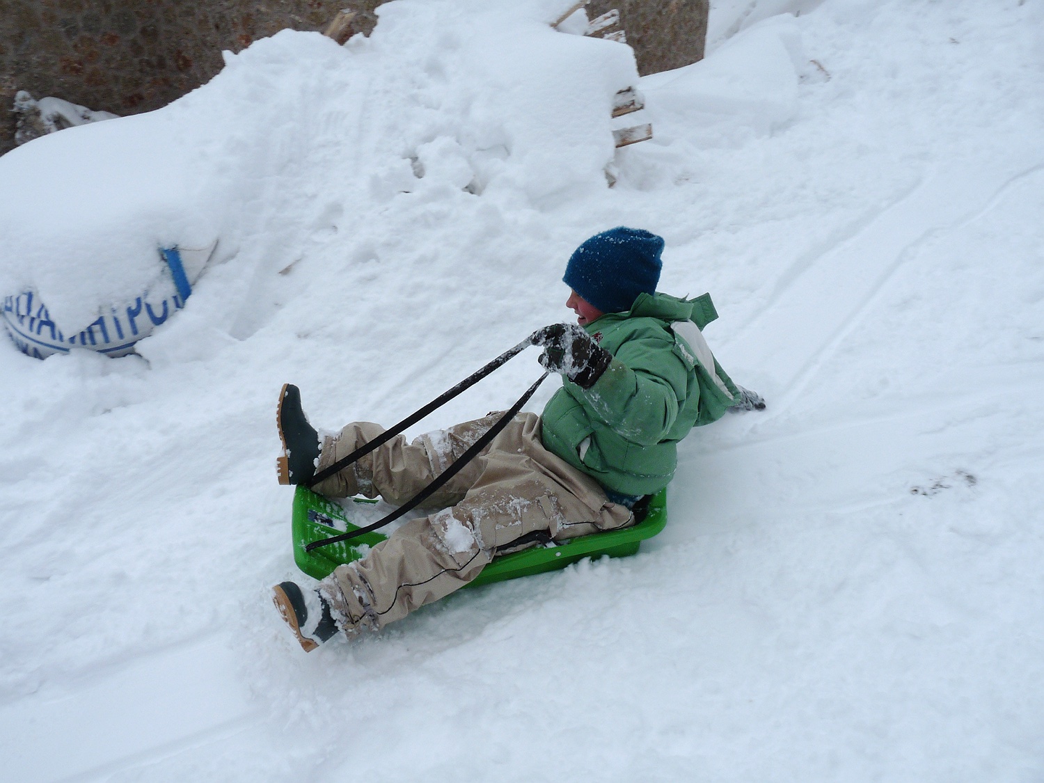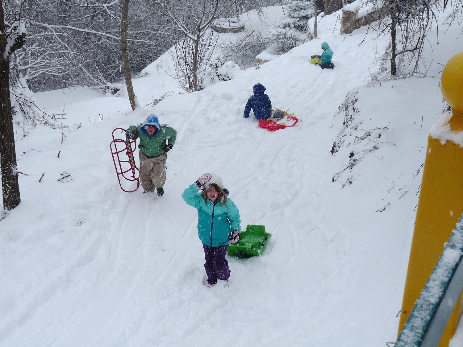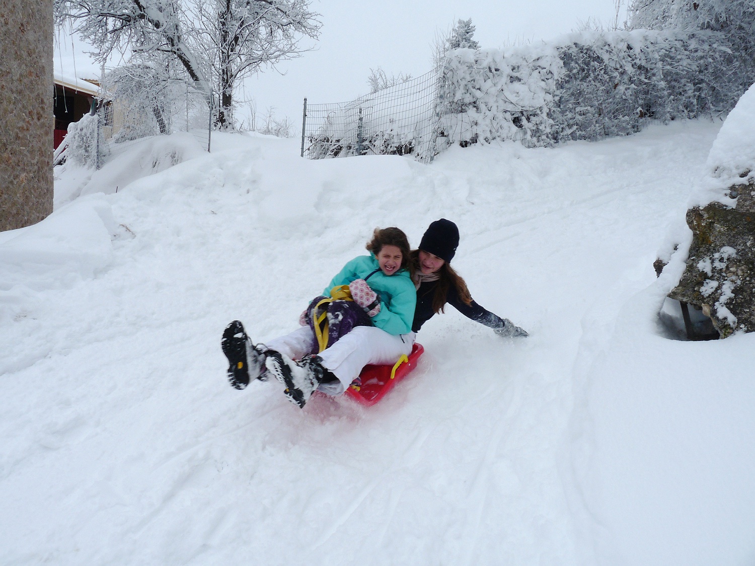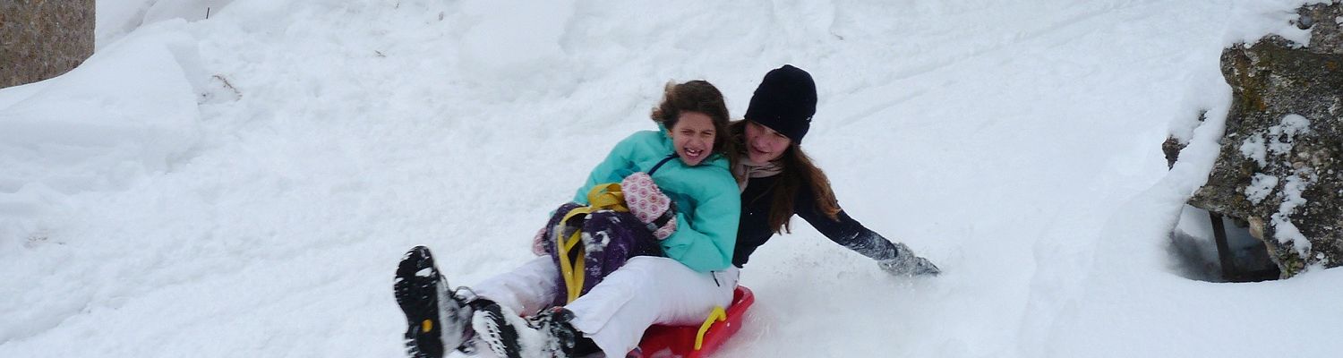 Am zweiten Tag schneit es fleißig weiter, so dass wir zwar nicht mehr durch die Gegend fahren können oder weite Wanderungen machen, aber für die Kinder ist sowieso das Schlittenfahren die größte Attraktion!