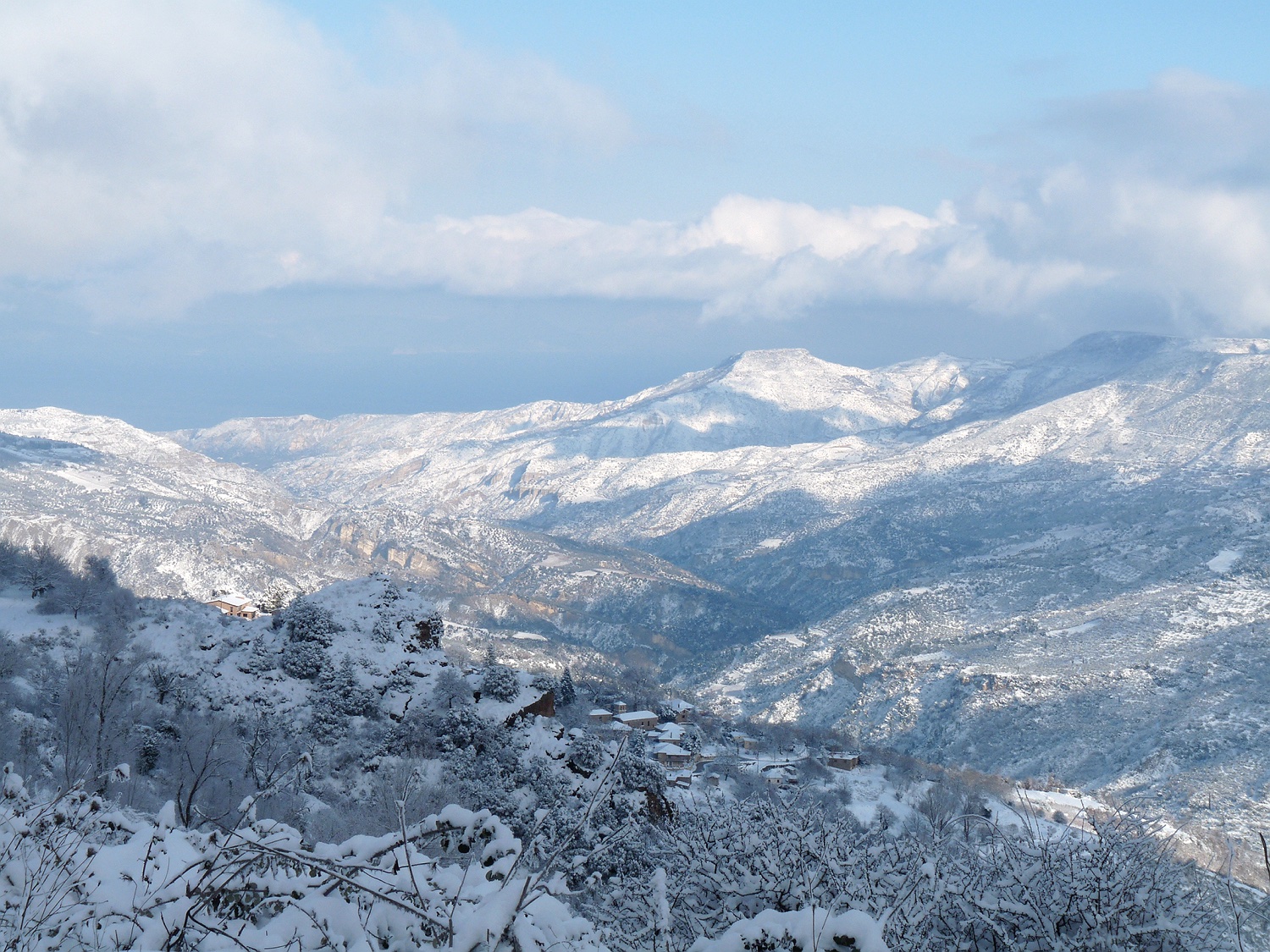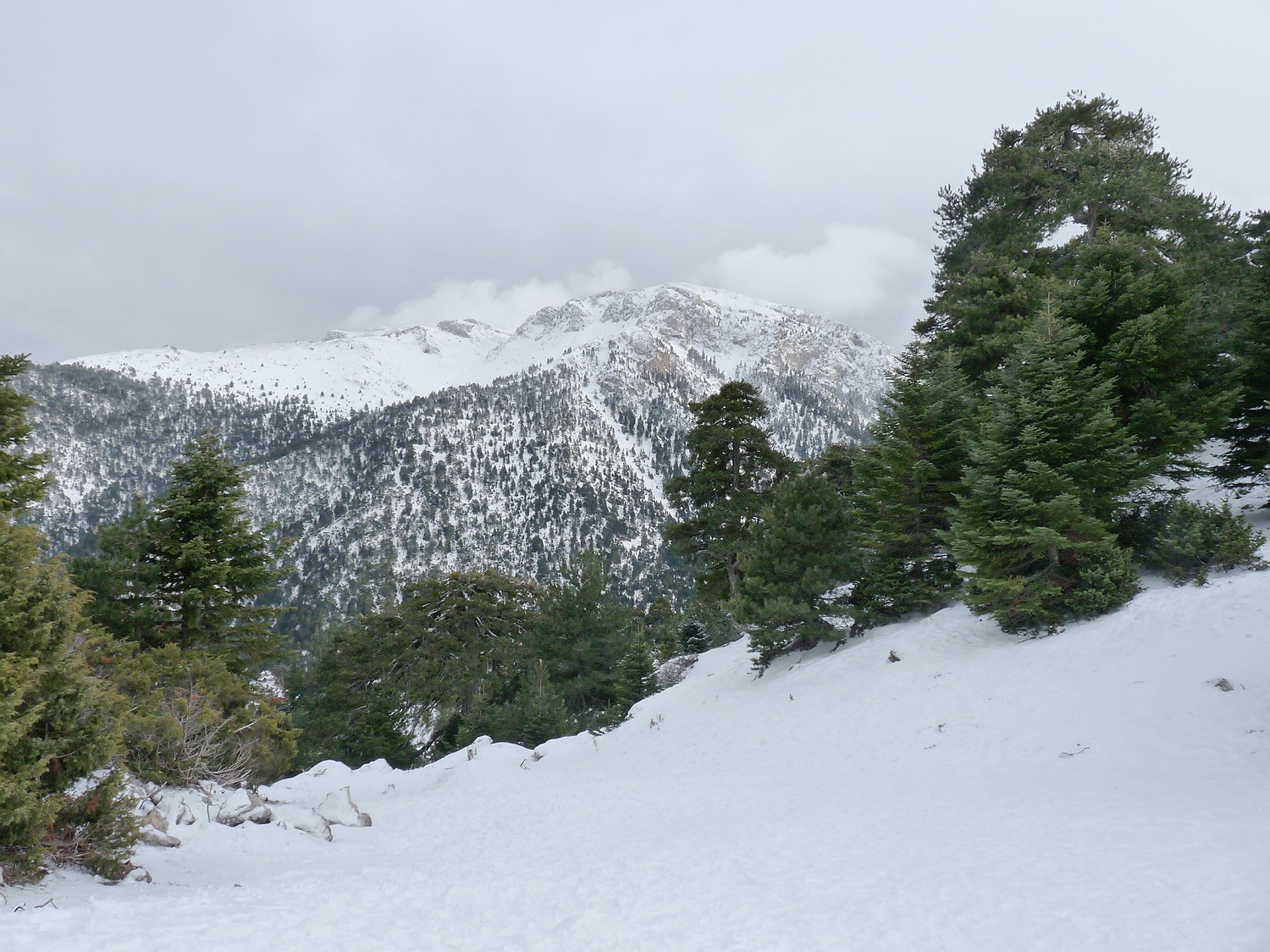 Am letzten Tag kommt die Sonne heraus und alles sieht noch schöner aus. Nun liegt Schnee bis unten ans Meer! Im Hintergrund sieht man den Golf von Korinth und die gegenüberliegenden Berge.