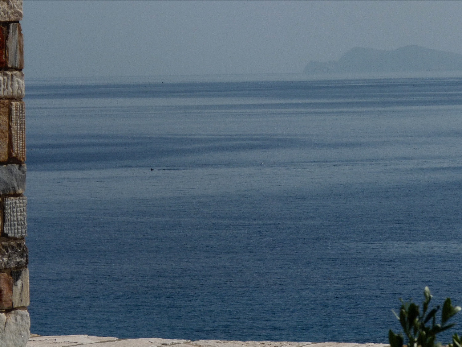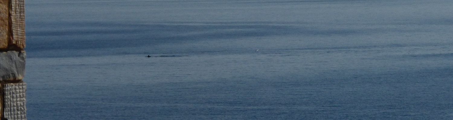 An windstillen Tagen kann man gelegentlich direkt von unserem Grundstück aus Delfine beobachten. Heute hielt sich eine kleine Gruppe von mindestens fünf Tieren recht lange in Sichtweite auf und war mit dem Fernglas von unserem Balkon aus gut zu beobachten – zum ersten Mal habe ich die Tiere auch häufig gänzlich aus dem Wasser springen sehen. Die Bedingungen zum Fotografieren waren (ohne Teleobjektiv) aufgrund der Entfernung natürlich nicht besonders günstig, aber ich habe es trotzdem versucht – hier die Ergebnisse.