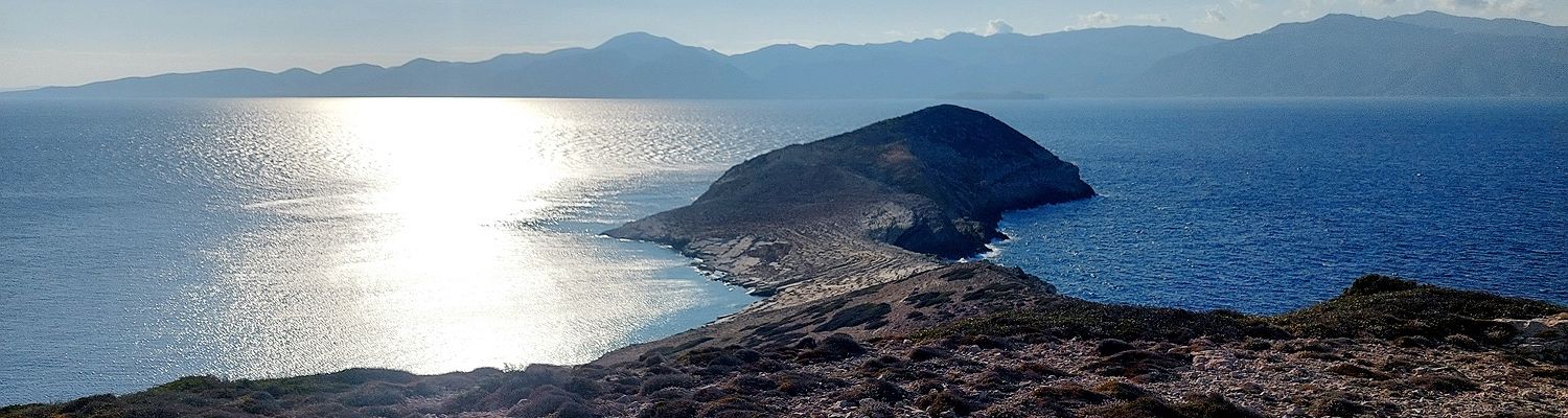 Vor ein paar Tagen war es ganz besonders klar. Hier der Blick etwa vom Stavrós tis Keramotís Richtung Osten mit den Inseln Mákares (vorn), Donoussa (links), im Hintergrund Kínaros und Lévitha und ganz hinten Kálimnos, Léros und die fernen Berge der Türkei (vermutlich sieht man die bis etwa 1.300 m hohen Berge südlich von Izmir) – letzte sind immerhin über 200 km entfernt.