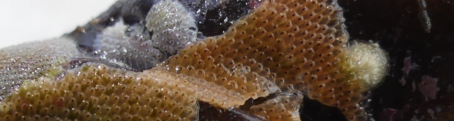 In this colony of moss animals the tiny cystids with their openings are visible.